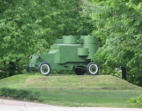 Зато от проходной хорошо просматривался памятник-броневик, тоже за воротами. Это "Русский Остин" времен Революции и Гражданской войны (выпускался с октября 1917 г.). Броня, естественно, — Ижорских заводов: