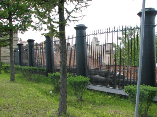 Позади памятника — красивая заводская ограда 1830-х годов, чугунная решетка с опорами из бракованных пушечных стволов. Архитектор В. Гесте. Говорят, что раньше эти стволы служили вытяжными трубами на местных кузницах.