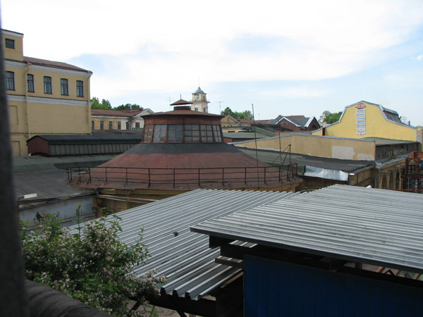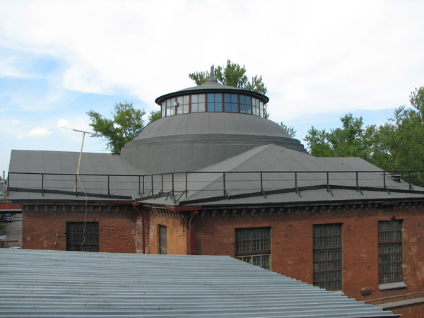 За оградой несколько циркульных промышленных зданий старых Ижорских заводов. Судя по литературе, это кузницы 1830-40-х гг. постройки: