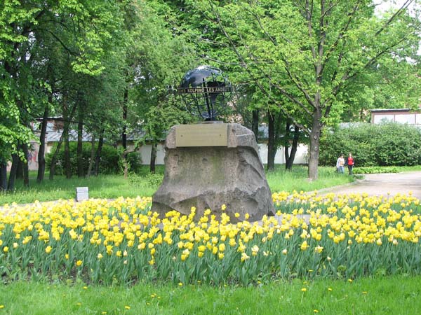 С бульвара Свободы мы выедем в заречную часть Колпино, где на улице Урицкого в сквере у районной администрации есть еще несколько памятников. Само место именуется "Аллей Дружбы", причем специальный памятный знак указывает, что она была посажена в 2002 году в ознаменование 280-летия Колпино делегациями из городов-побратимов Лазанделиса (Франция), Кизляра (Дагестан, Россия), Могилева (Белоруссия), Раума (Финляндия), Хуань (Китай), Бланкенезе (Германия) и Шомонта (Франция). Об этом свидетельствует и памятник-"глобус", водруженный, кстати, на надгробном камне, давным-давно уворованном с городского кладбища: