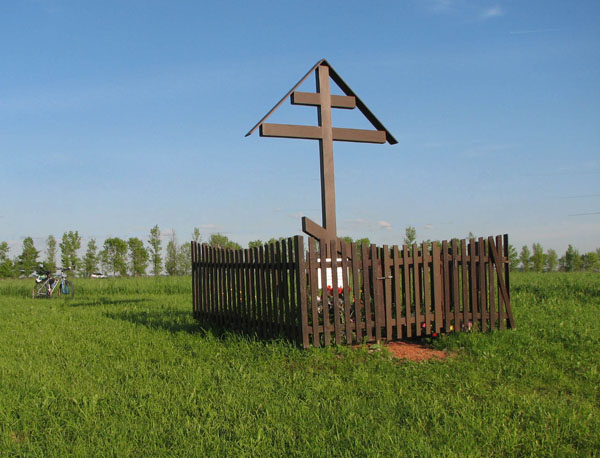 Когда я ехал далее в Ям-Ижору, мое внимание привлек большой деревянный крест, поставленный в полях между рекой и дорогой, по правую руку. Подъехал поближе. Надпись гласила, что "Сей крест воздвигнут и освящен 22.05.1997 г. усердием прихода храма Вознесения Господня г. Колпино в честь обретения иконы Святителя Христова и Чудотворца Николая на этом месте в 1713 г.":
