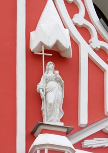 Пы.Сы. Слоны слонами, но претензии на то, что "единственный раз, и только у нас", не всегда правомочны. На то и велика Россия, что "небываемое может бывать" везде. Но и без того - если не "уникального", то "очень нестандартного" в оформлении нашей Чесменской церкви немало. К примеру, использование свойственной католицизму (и чуждой православным традициям) церковной скульптуры - причём не только с типичном стилевым приёмом "балдахинчика", но и с неправославным 4-конечным крестом в руках!