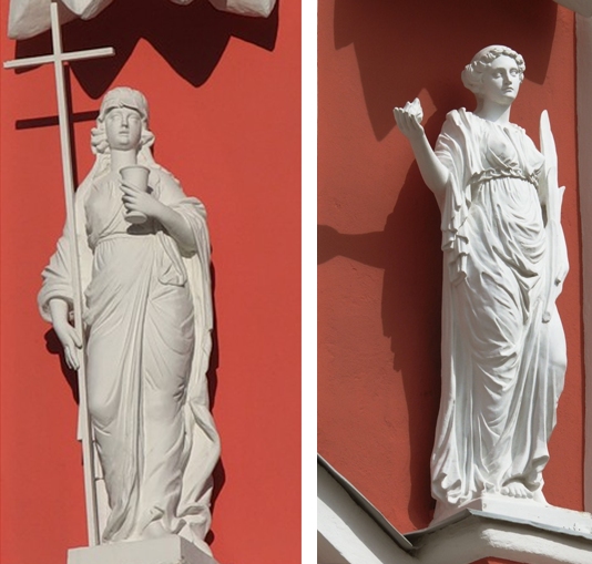 Статуи эти в любом случае не оригинальны: в 1990-е годы их снимали для реставрации - на фото церкви в энциклопедии СПб. статуй нет, а есть для них упоры. По ряду признаков кажется, что вновь поставленные сейчас (особенно та, что справа)... как бы помягче выразиться... не вполне канонические.