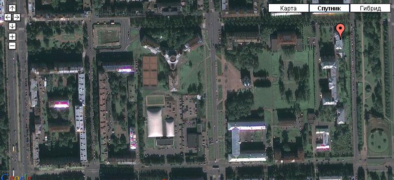 Ну, а ракурс съёмки - метров 7 южнее от этой точки (на следующей, если двигаться вправо, деревья загораживают вид на больницу):