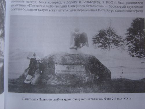 В книге Александра Гейрота 1868 года "Описание Петергофа" про те места сказано так: "По отлогости Бабигонских высот распологаемы были на лето, лагерем лейб-гвардии саперный батальон и рота воспитанников инженерного училища, которые в продолжение всего лагерного времени вместе с саперами участвовали во всех практических саперных и минных работах. Там же в поле близ дороги на огромном, диком камне красуется колоссальный медный орел с распростертыми крыльями, работы профессора барона Клодта. Под орлом на камне медная доска с надписью: " Подвигам лейб-гвардии саперного батальона". Орел поставлен по повелению императора Николая Первого в 1852 году"
