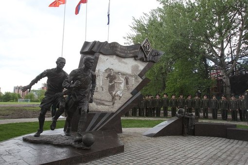 Памятник в честь героев-футболистов установлен рядом с полем. На каменной плите изображены двое спортсменов во время игры. Они выложены из мозаики по фотографии из старой газеты. Рядом с футболистами - военная форма. Проект монумента рассматривался в марте 2012-го на заседании градсовета, когда решение по его установке было уже принято.
