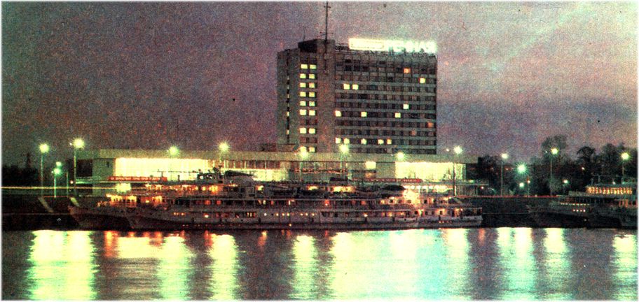 "Величественно возвышается на берегу Невы 16-ти этажное здание гостиницы уровня «3 звезды» - «Речная». Она входит в состав Речного вокзала ОАО «Пассажирский порт». Удачное расположение дает постояльцам возможность наслаждаться из окна номера прекрасным видом на реку, разводной Володарский мост и благоустроенную лесопарковую зону. Вечером зрелище по-своему уникально, так как «город Петра» меняет свой облик, загорается тысячами огней и вид спокойной, вальяжно несущей свои воды реки, никого не оставит равнодушным." (Из каталога гостиниц С-Петербурга)