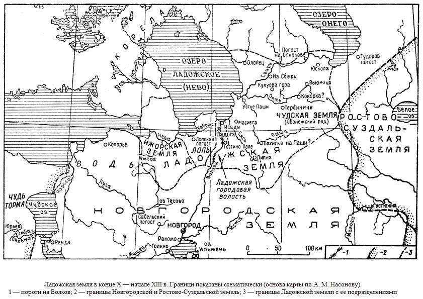 ...Иноязычные территории примыкали к Ладоге и с запада (рис. 1). Речь идет о южном Приладожье, населенном лопью.[129] К самой Ладоге вплотную подступали саамские селения, еще в конце XVI—XVII вв. составлявшие особую Силосарскую волость (возле Старой Ладоги и поныне имеется д. Лопино).[130] Далее на р. Лаве и восточном побережье юго-западного залива Ладожского озера, по данным писцовой книги Водской пятины, около 1500 г. помещалась волость Лопца. В более раннее время зоны саамского расселения в южном Приладожье были более обширными и объединялись в единый регион, располагавшийся, судя по топонимическим данным, между реками Волхов и Мга. Тесная связь всей этой области преимущественно с Ладогой вполне вероятна и естественна. Таким положение оставалось примерно вплоть до XIII в., когда Лопская область, названная сотней, фигурирует уже в составе Новгородской земли.[131]