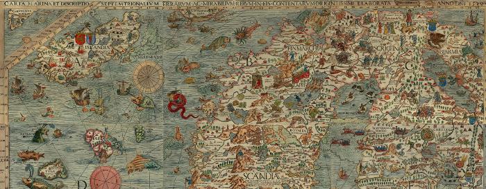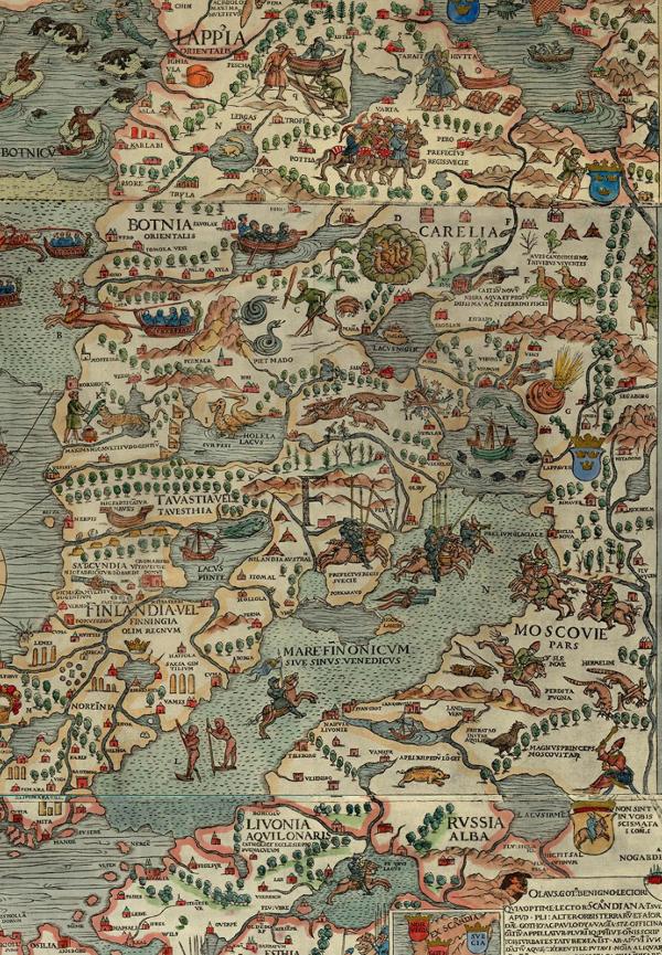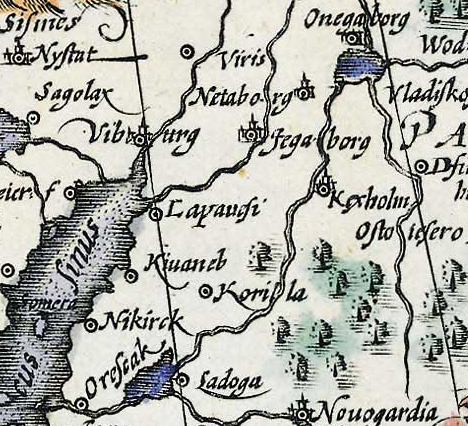 Здесь Орешек присутствует на примерно своем места (скорее, на месте будущего Ниена) как Orescak, и где-то в Прионежье как Netaborg, где-то рядом с Onegaborg, в котором, кажется, слились воедино Олонец и Каргополь. Здесь есть и Korilla и Kexholm, причем оба близко друг от друга и от реки Свирь. Есть и Ladoga почти на своем месте, и крепость Jegaborg, помещенная куда-то на реку Вуоксу. Последний загадочный топоним обычно отождествляется с той же Альдегьяборг, Ладогой.