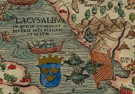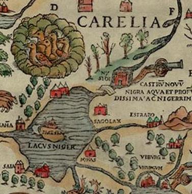 На приведенном рисунке показана не крепость Орешек. Там даже подпись — Pagesca. А "Черное озеро" — без сомнения, Сайма. Тут рядом (чуть севернее) и Nyslot = Нейшлот = Савонлинна. И Sagolax = Саволакс, преобразованное из провинции в населенный пункт. Iokas отождествляется с Jokkas. Что такое Pagesca, а также Mahna или Manha — наверняка неизвестно. И само озеро правильно нарисовано — северо-западнее Выборга. Никакой "черной реки" там нет. Написано дословно: "Нюслот. Новая крепость. Вода черная и из самой бездны. А также наичернейшие рыбы". (Слово profundissima можно понять и образно — "из самой преисподней", и просто — "очень глубокая".) Белое озеро — это Белое море, которое еще не догадались соединить проливом с океаном. Меркатор чуть позже лихо решит эту проблему таким образом, что нарисует и Белое море, назвав его "Bella more, то есть Album mare [= Белое море]", но и Белое озеро (правда, в сильно уменьшенном виде) в центральной Финляндии — северо-восточной Карелии сохранит, примерно Пяозеро + Топозеро вместе взятые.
