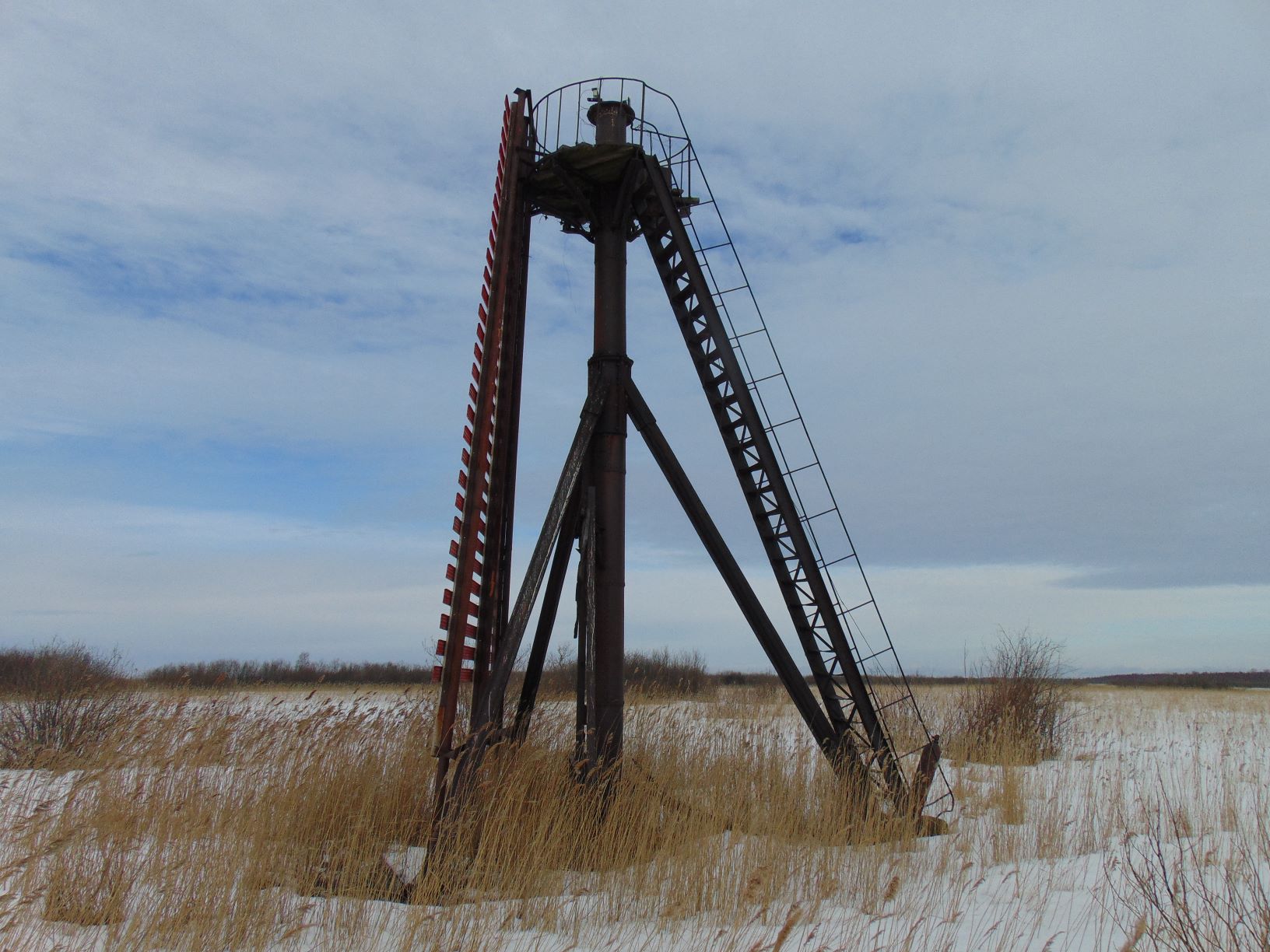 Похоже прояснилось происхождение металлического маяка на Торпаке. Посетил остров Горготуха в устье Свири. Меня интересовал Чомбовский створ. Первый створный щит опирается на мачту силуэт которой указывал на родство с металлической мачтой на Торпаке. Осмотр вблизи подтвердил предположение - мачты по конструкции очень схожи, различия в деталях. Обходя створ заметил в камышах по направлению маяка в Лисьей (второго знака Чомбовского створа) три наклонных столаба. Думаю отсюда мачта и переехала на Торпак.