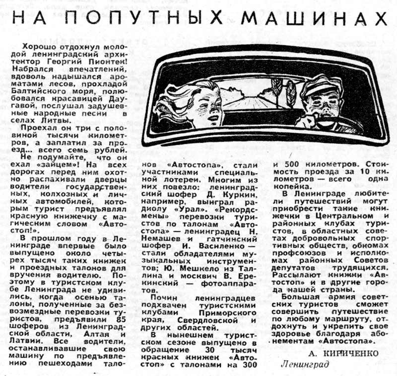 Заметка из журнала "Здоровье" (№8, 1962г)рассказывает о талонах для любителей автостопа.