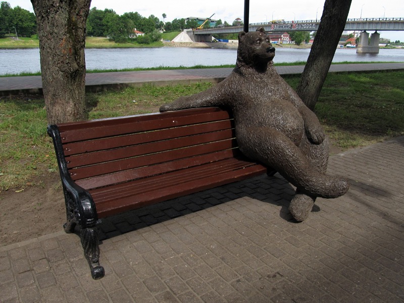 Ещё дальше от туристки на скамейку присел медведь. Видать тоже устал от хождения по Новгороду