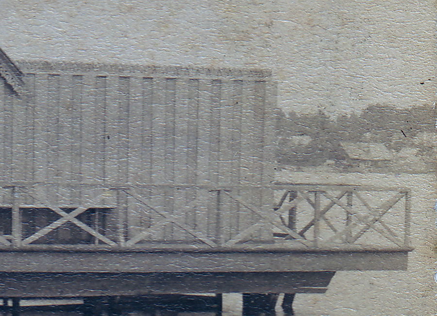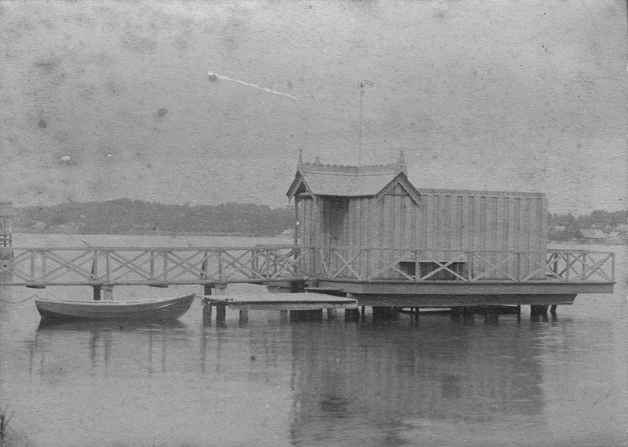Полагаю, что это пристань, и уже заколоченная на зиму. Для купальни это сооружение слишком над водой возвышается. Есть похожие фото на Нижнем Суздальском озере, но у той пристани крыша ровная не изгибается, как здесь. Но их же было там три! А фотографировали в основном одну, с видом на Шувалово. Возможно на Вашей открытке одна из двух других, предположительно у Шуваловского вокзала? Но пока аргументов нет...