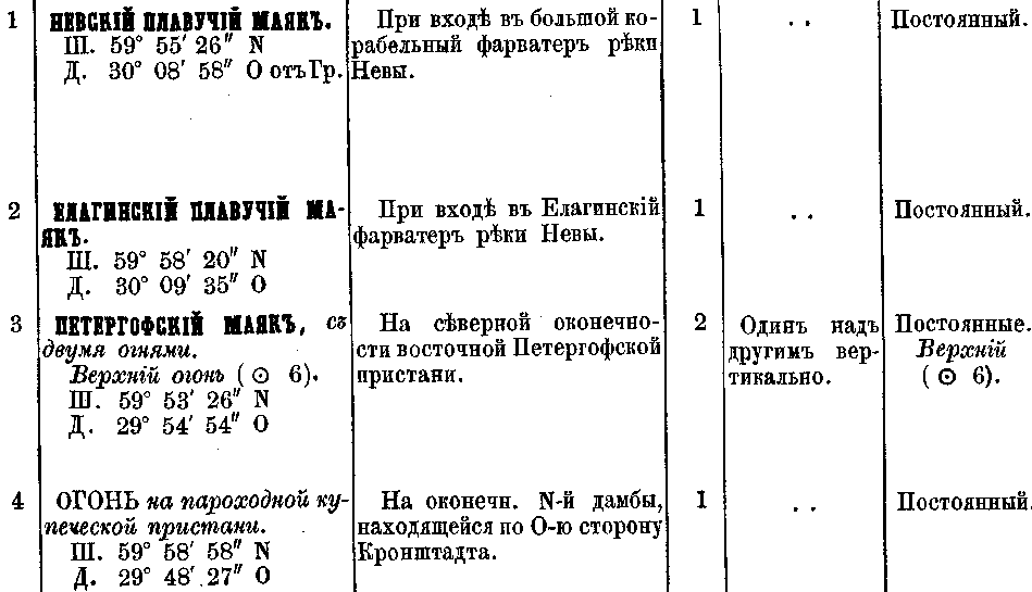 Есть такая таблица "Маяки и гаванские огниРоссийской империи", издания 1867 года.
