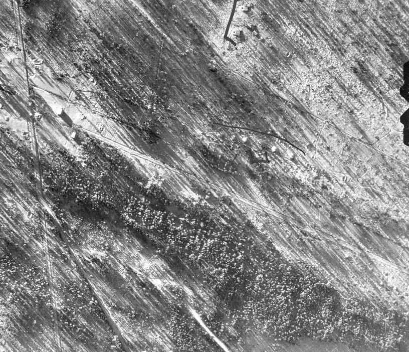 Вот так это выглядело в январе 1943, к сожалению метров 300 не хватило, чтоб искомый участок попал в кадр. Лес вынесен напрочь, оставлено чуть-чуть видимо для маскировки.