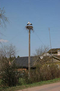 Добравшись по шоссе до поселка Красный Луч, свернули направо, проехали деревни Сумск и Волпи и остановились в Морозово. Во дворе домика, стоящего на краю деревни, стоял старинный каменный амбар, доверху набитый сеном, а через дорогу мы увидели огромное гнездо и в нем пару аистов, которые трогательно чистили друг другу перышки