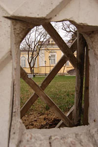 На обратном пути вдоль забора мы случайно углядели дыру наподобие кошачьего лаза, непроходимую для злоумышленников, но, видимо, призванную утолить краеведческий голод желающих увидеть, как выглядит восстановленный Охотничий дворец.