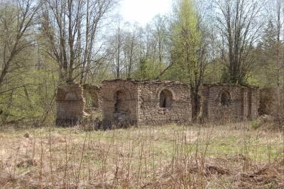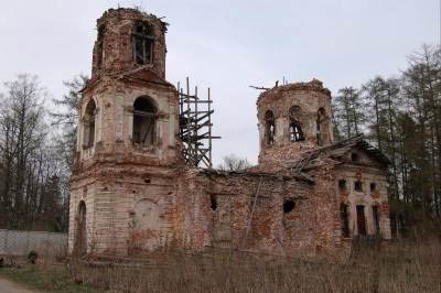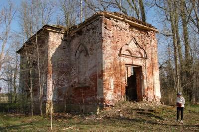 Проехав вдоль забора, мы увидели развалины церкви иконы Владимирской Божьей матери (1766; предположительно арх.С.Чевакинский).
