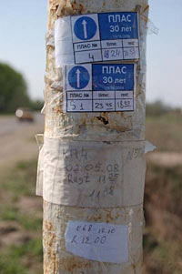 …и тут же обнаружили на столбе КП; вполне возможно, что велопроходцев в этом краю мало, однако автомобильные соревнования не обходят своим вниманием Волосовские асфальты: