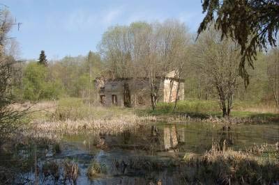 Пробираясь по хрусткой прошлогодней траве сквозь сухой малинник, я уже привычно боялась медведей, как вдруг почувствовала шевеление на спине и тут же поймала на себе первого в этом сезоне клеща. В разрушенные дома заглядывать было страшновато, и мы прошли в сторону милого заросшего прудика, окруженного старинными елями и лиственницами: