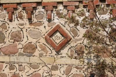 На стене одного из строений в нарядном обрамлении кирпичей и мелких камешков неявно читается год постройки: