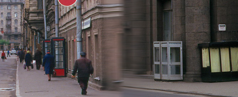 По поводу жёлто-красной телефонной будки, вызвавшей сомнения относительно "приписки" к определённому городу: по конструктиву она ленинградская. Такие точно были в 80-х годах и даже раньше. Но цвет точно не тот. Были тёмно-красные с чёрным или серым. Изображённая на фото скорее всего перекрашена. И фото явно 90-х годов. Таксофон внутри кажется кномочный.