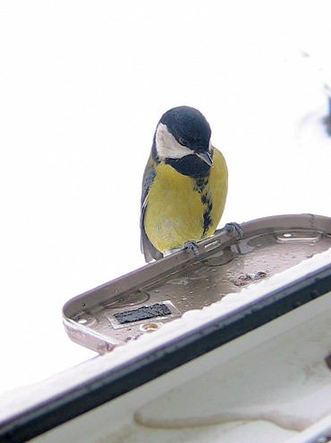 "С наступлением зимы их выбор становится ограниченнее (многое засыпано снегом), и большие синицы становятся еще менее разборчивы в пище, но более смелы. Близ жилья они отыскивают всякие отбросы пищи, расклевывают даже падаль и мороженое мясо. От голода они иногда нападают на более слабых птиц, убивают их и выедают мозг.
