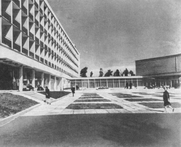 Пансионат «Дюны». Архитекторы Э.И.Ярмолинский, М.Б.Серебровский, Ю.А.Прокофьев; инженеры Т.П.Леонтьева, И.П.Филатов.