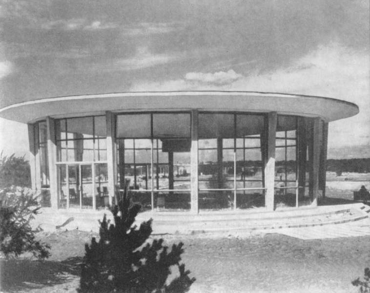 Пансионат «Дюны». Пляж. Танцевальный павильон. Архитекторы Э.И.Ярмолинский, М.Б.Серебровский, Ю.А.Прокофьев; инженеры Т.П.Леонтьева, И.П.Филатов.