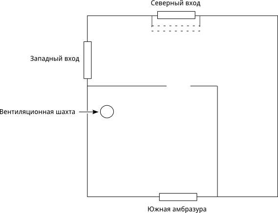 Северный вход был недавно укреплён снаружи. Ранее там не было козырька и вместо железной двери было две деревянных двустворчатых. К западному входу внутри помещения был сделан пандус из битого кирпича и земли, у северного входа был "предбанник" и ступенька (уровень двери выше пола на 50 см). Южный вход - в виде амбразуры, отстоящей от пола на 50 см.