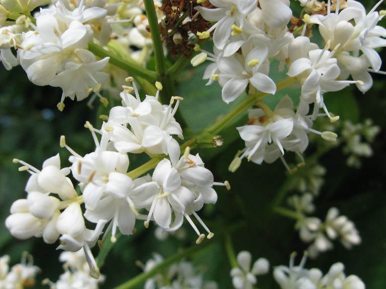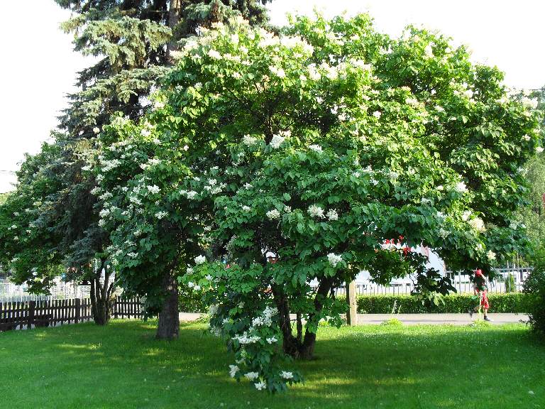 Вид белых со слабо кремовым оттенком цветов, соцветий в виде кистей, а также листьев кажется напоминает семейство масличных; что-то, отдаленно напоминающее сирень. Но цветет намного позднее сирени – в этом году зацвели в начале июля.