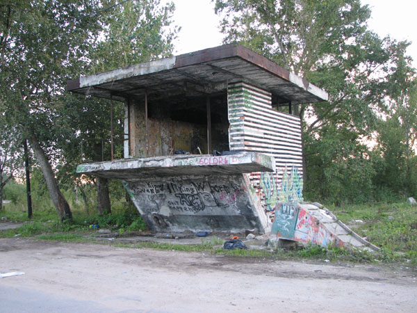 Вот по шоссе-то мы и направимся в сторону города, чтобы не оставить в стороне Усть-Славянку. Последняя уже не деревня и даже не поселок, а не более, чем "исторический район Петербурга". Помимо славного имени, восходящего, кстати, к XIV веку, и вечной как само время реки, история здесь сконцентрирована, в основном, в двух местах, отстоящих друг от друга метрах в 200-х. То есть в одном месте. Первым по дороге попадется заброшенный (!) пост ГАИ, и не просто какой-то пост, а типовое сооружение начала 1970-х гг.: