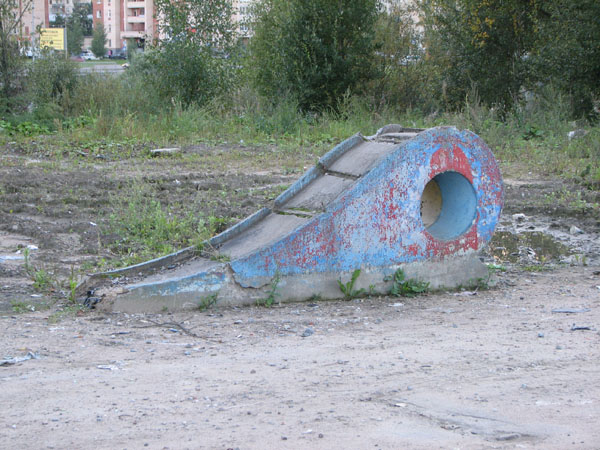 В чем-то даже красивое, можно сказать — уже почти памятник архитектуры. Жаль, загажено. Внимательный глаз уже рассмотрел рядом горку-"слоник" из незабвенных воспоминаний детства. Вот и вторая рядом:
