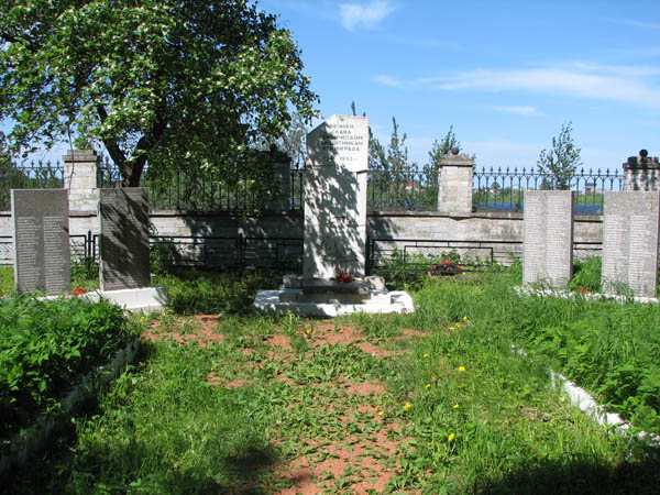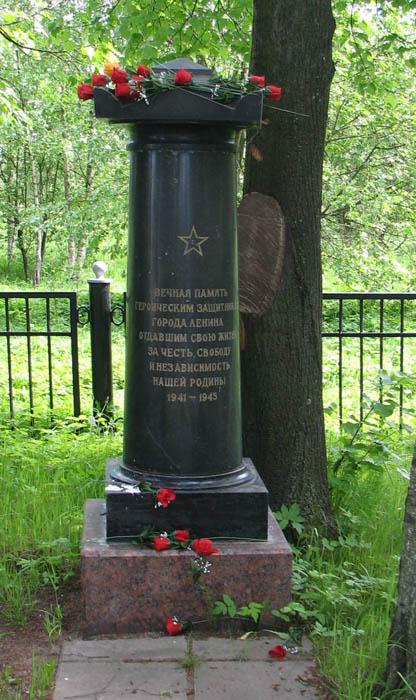 По той же Верхне-Ижорской улице вернемся к шоссе, пересечем его и вскоре окажемся у церкви. Но чтобы не разрывать впечатления от разных исторических эпох, сначала зайдем за церковную ограду. Здесь когда-то было старое Усть-Ижорское кладбище, от которого мало что осталось. И здесь же в уголке скромно поместилась еще одна братская могила времен Великой Отечественной войны поменьше — стела и четыре плиты с именами:
