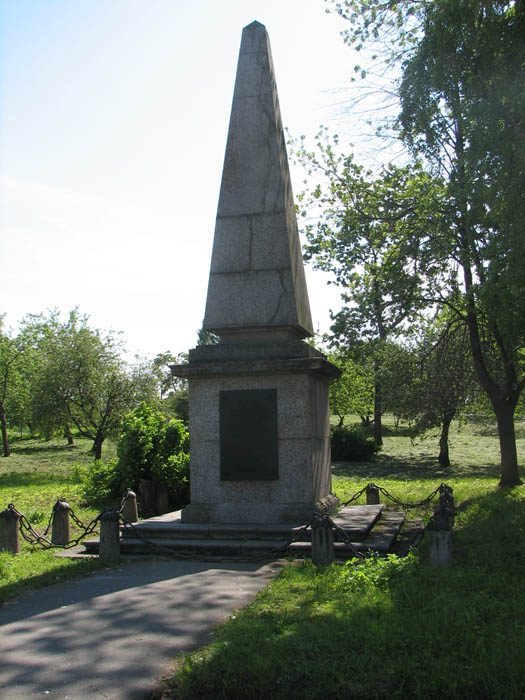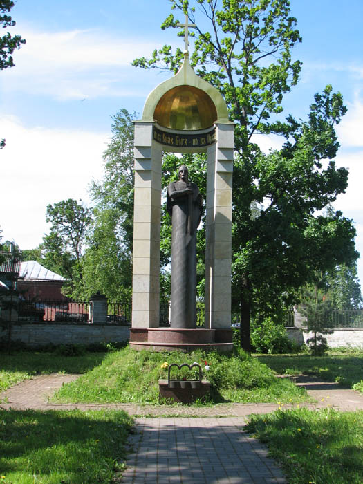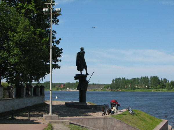 Именно на этот берег с шоссе по хорошему, нет, даже отличному асфальту и возят туристов на автобусах. До церкви они добираются пешком через мост. (А я-то по наивности думал, что их — по булыжничку, по булыжничку на том берегу!) Немного выше по течению на берегу реки стоит памятный знак, посвященный собственно Невской битве: