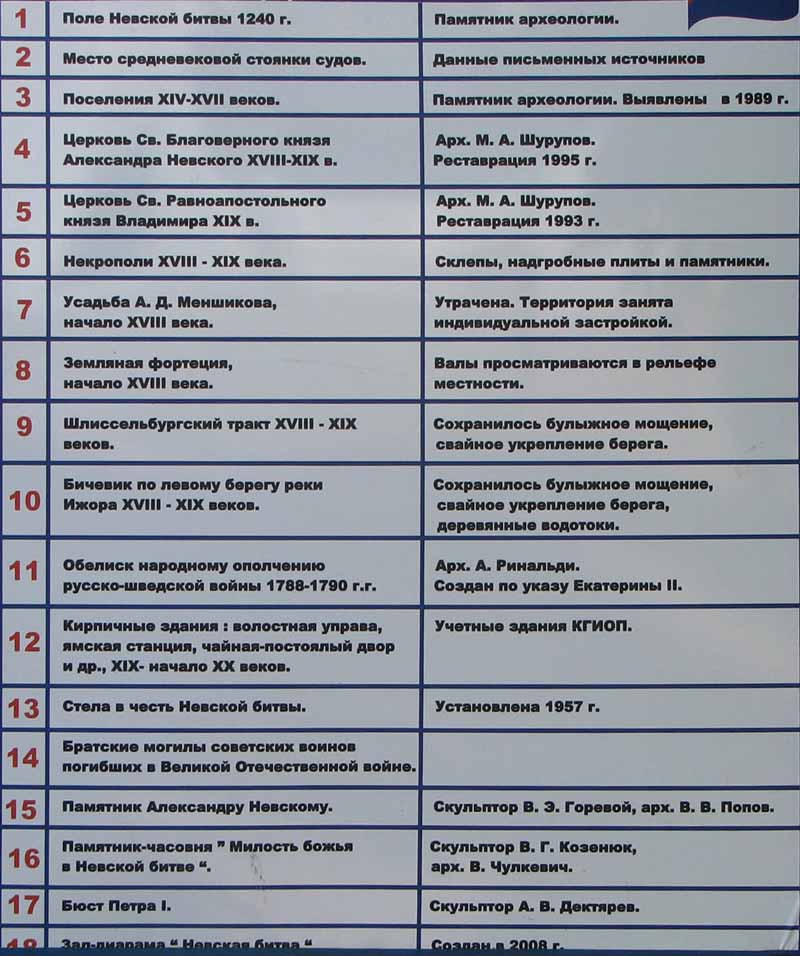 Как видим, в охранную зону попадают и бичевник вдоль Ижоры, который использовали для подъема к Ижорским заводам груженых барж, и булыжное покрытие на старом Шлиссельбургском тракте (ему — отдельное спасибо от моего велосипеда!) и даже археологически выявленные поселения XIV века. Правда указанный в объявлении URL-адрес музея оказался мертвым, поэтому, на всякий случай, переписываю сюда этот документ: часы работы с 10 до 16 без обеда и выходных, стоимость билета от 60 до 100 рублей в зависимости от экскурсий, телефон (812) 462-41-53. Его официальное название — Музей "Александр Невский и Невская битва. 1240 год".