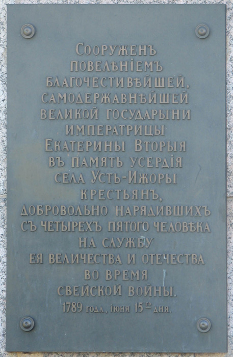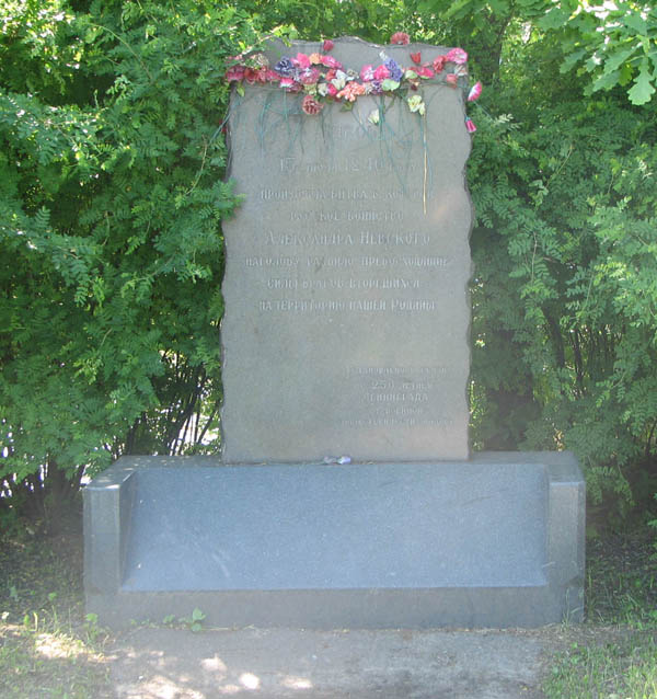 Надпись: "Здесь 15 июля 1240 года произошла битва, в которой русское воинство Александра Невского наголову разбила превосходящие силы врагов, вторгшихся на территорию нашей Родины. Установлено в связи с 250-летием Ленинграда. От военной общественности города". То есть, в 1953 году. Насчет превосходящих сил противника — это, скажем так, вольная интерпретация летописи. И, кстати, что именно установлено?
