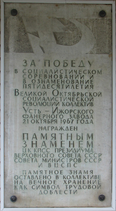 Попутно я, кстати, проверил возможность объезда Шлиссельбургского шоссе по продолжению Волховстроевской улицы до Лагерного шоссе, и пришел к выводу, что эти полтора километра по худой грунтовке без покрытия — не подарок. Лучше сделать крюк в 5 км по асфальту, свернув с Лагерного шоссе по Первомайской улице с последующим поворотом на ту же Волховстроевскую... По Волховстроевской же я доехал до улицы Фанерной, которая упирается в проходную Усть-Ижорского фанерного комбината. На здании заводоуправления — мемориальная доска в честь трудовых подвигов заводчан: