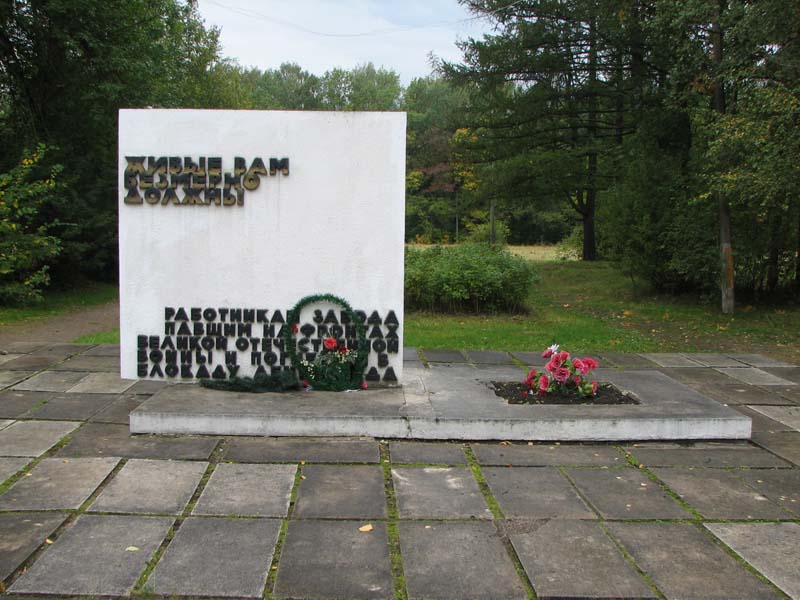| Леонид Харитонов писал(а) чт, 09 сентября 2010 09:34 | Ну а я потихоньку приближаюсь к конечному пункту своего путешествия. Хотел я еще заехать и сфотографировать братскую могилу на территории бывшего завода "Ленспиртстрой" на восточной окраине Саперного. Завод находился в двух километрах за 2-м противотанковым рвом, к которому удалось прорваться немцам. 1 сентября 4-я дивизия народного ополчения отбросила их от рва к Усть-Тосно, освободив соседнюю деревню Новая. Так что завод находился почти на линии фронта, его огромный разрушенный корпус после войны не восстанавливали, так как он до недавнего времени служил съемочной площадкой для "Ленфильма". Эти развалины и сейчас видны с шоссе. Организационно территория бывшего завода после войны принадлежала и принадлежит в/ч 20570 — 18-му арсеналу. А где в/ч, там КПП. Пункт оказался наглухо закрыт, достучаться ни до кого я не смог, и уехал ни с чем. Хотя мероприятия у этой могилы, конечно, проводятся. По крайней мере, 7 мая сего года здесь был митинг и возложение венков. Выкладываю фотографию, взятую с учетной карточки Колпинского райвоенкомата, 2001 г., ОБД "Мемориал":