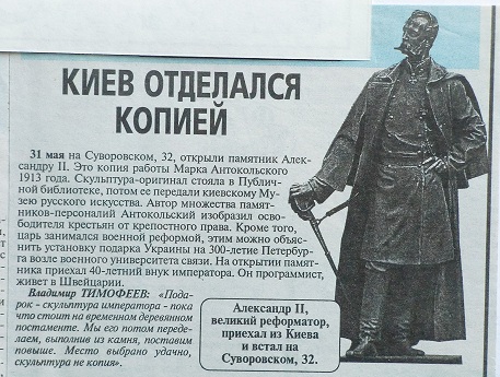 Вот ещё заметка С.Глезерова на ту же тему http://www.whitestrip.ru/articles/view/1424/ (фразы про "более чем тридцать памятников Александру II в северной столице" и про "статую работы М.Антокольского у Киевского Института благородных девиц" оставим на совести автора).