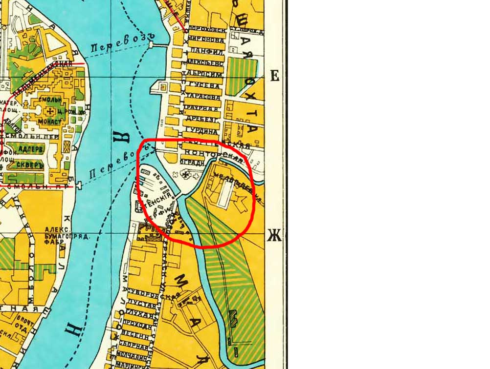 Интересно, что на этой съёмке ещё виден изгиб Охты в районе старого моста.