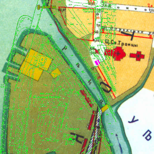Сопоставим с планом 1909 года, на котором точно обозначено местоположение церкви.