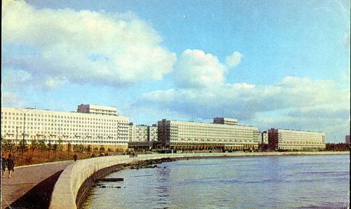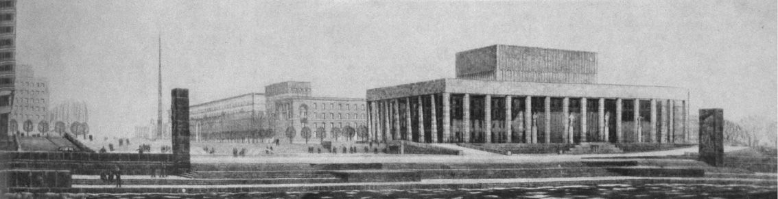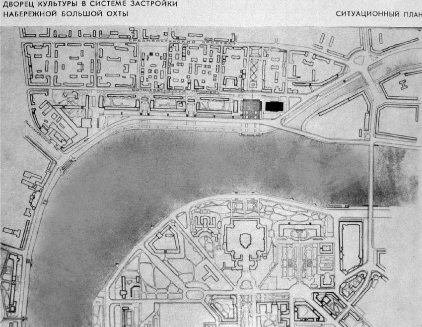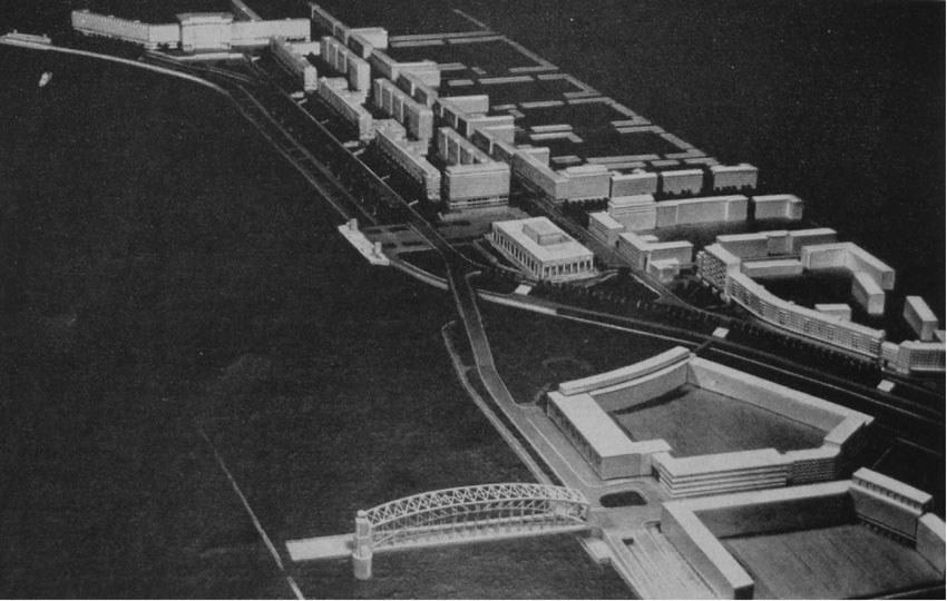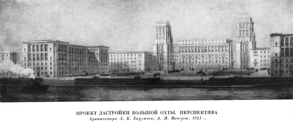 по оси Смольного собора должна быть эспланада. Из изображённого построен дом 8 по Среднеохтинскому пр., но в усечённом виде (без башен), дом по Большеохтинскому пр., 7 или 9 (тот, что справа в глубине) и спуск к воде с пристанью. Всё остальное попало под хрущёвское секвестирование. Но, по правде говоря, не очень жалко. Мне кажется, какая-то усталость появилась к 50-м годам от многочисленного тиражирования классицистических форм. То, что в итоге успели построить на Свердловской наб., смотрится вполне достойно. Это тот же приём противопоставления монументальной простоты и барочной изощрённости, что и на Дворцовой пл., только площадью здесь является акватория Невы.