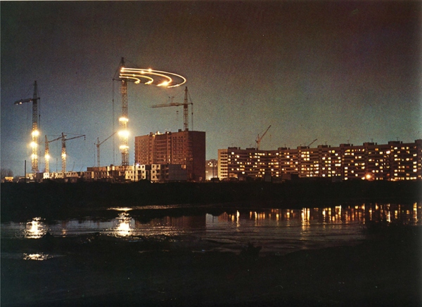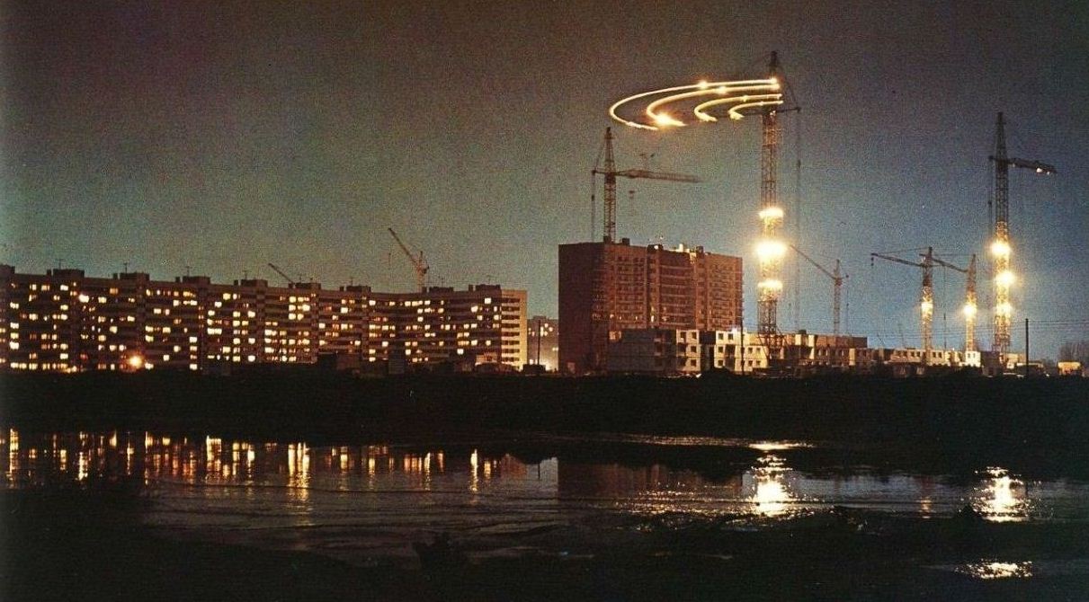 Выскажу свое мнение. Первое фото - не монтаж и не зеркальное отображение. Снято со стороны Смоленки. На фото дома по Наличной- 40,корпуса 1 и 2, строится корпус 4. Здания по Новосмоленской наб. еще не существует, как и самой Новосмоленской набережной. На карте маршрутов городского транспорта 1977 года левобережная часть этой набережной названа Октябрьским пр.