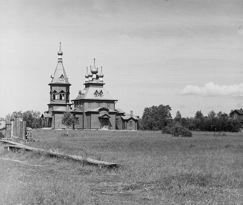 Я думаю, что на карте она представлена в виде широтно вытянутого прямоугольника чуть ниже отметки 7,7 на северном берегу Лавы, между каналами. Это соответствует фотографии [Мазелева], на которой мы видим улицу, проходящую севернее церкви, а также экспликации "Эвакуированные направляются к поезду", т. е. церковь должна быть по дороге от пристани к платформе. Кстати и домик "с мансардой", который виден на фото [Мазелева] слева, а у Прокудина-Горского справа (по-моему, это один и тот же дом) соответствует на карте дому к северу от улицы, у моста через Староладожский канал. Если я прав, то это означает, что Прокудин-Горский снимал церковь с берега реки Лавы, с того места, где на топографке обозначены сараи по берегу. Во времена Сергея Михайловича их, очевидно, еще не было.