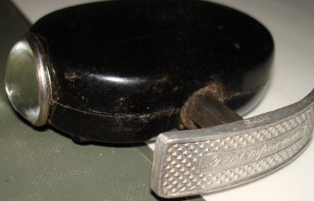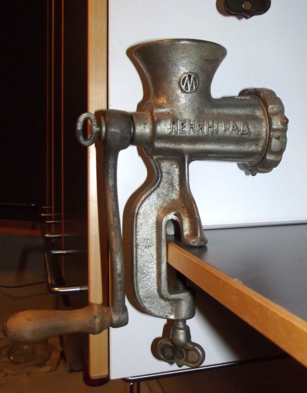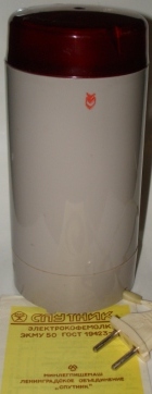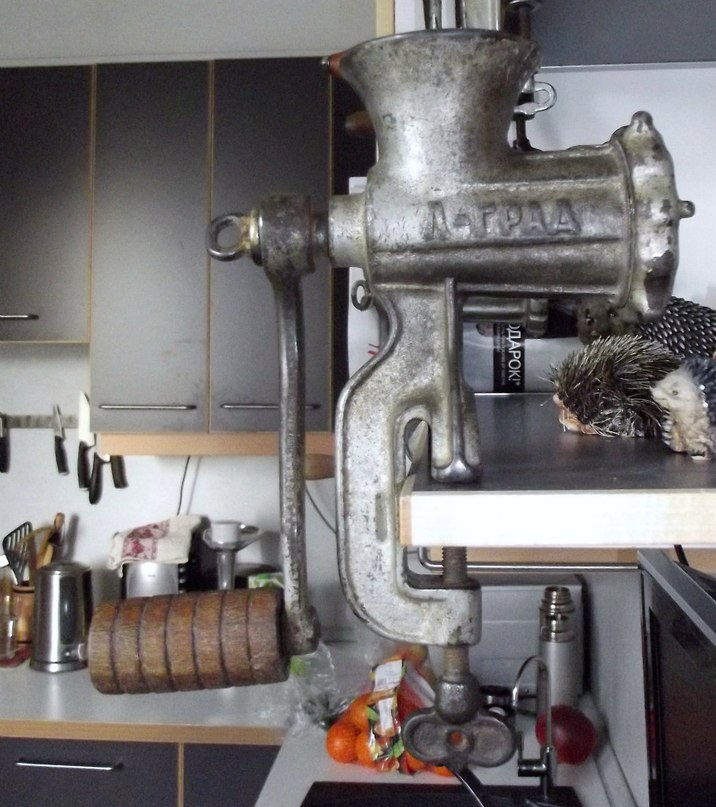 На мясорубке ,,полуаббревиатура,, "Л-ГРАД". А у меня есть фонарик под пару элементов "маленький бочонок" (323). С обозначением на крышке сзади: "ЛНГРД". Изделие 50-Х(?) годов.