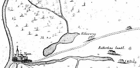 В-третьих. Рассматривал карту 1634 г. на предмет дорожки Токсово — Ниен. Тут есть свои интересные соображения, как восстановить трассу, не обвиняя картографа в ошибках, но не будем в кучу... А также на предмет дороги через Парголово и Агалатово. Ну, трактир (Udnis krog) у Суздальских озер, он не новость: есть и на других картах. Но обратил внимание на надпись "Butterlins Landt", т. е. "земля Буттерлина":