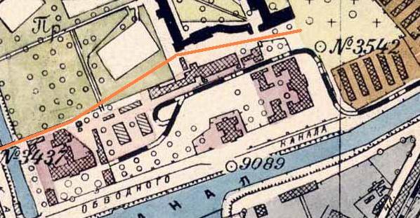 Он как раз сдвинут в сторону Обводного, но на откосах, прямо по центру улицы были