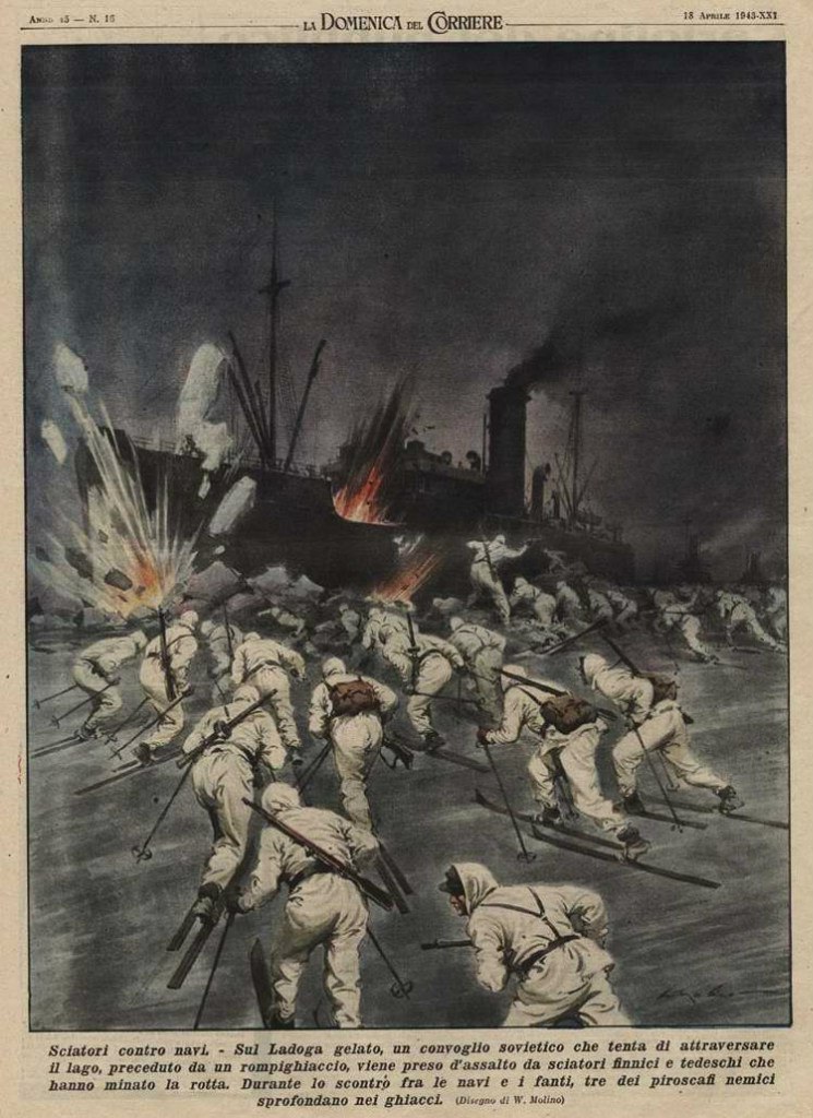 Надпись на русском: "Группы немецких и финских лыжников осуществляют нападение на караван советских транспортных судов на Ладожском озере"